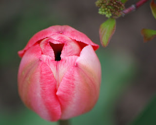 Isn't the picture on the right interesting? You can see the blur of pink tulips in the background, amid an entanglement of forsythia blossoms, and in the center of it all is one lonely, half-opened, cream-colored tulip.